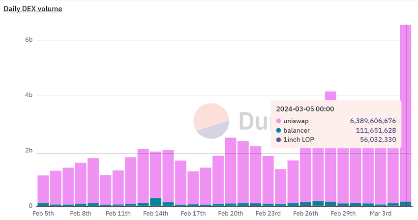 네트워크 참여 외에도 사용자들이 플랫폼에서 활발하게 거래를 진행하면서 유니스왑 DEX의 사용량도 급증했습니다. 유니스왑의 일일 거래소 거래량은 지난 24시간 동안 63억 달러를 넘어섰습니다.