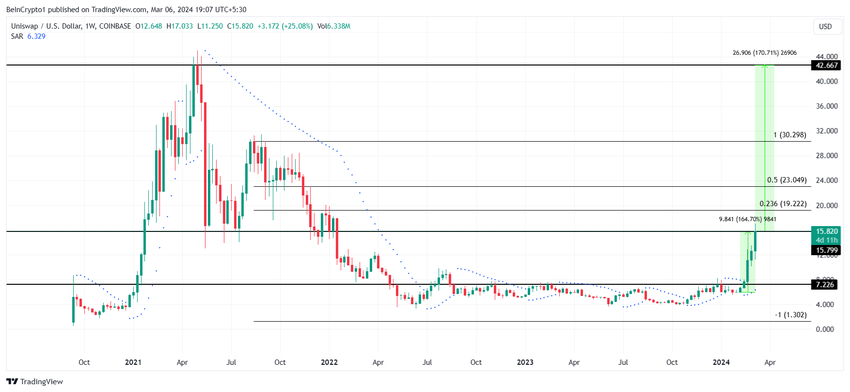 이는 사용자들에게 상당한 이익을 가져다주었지만, 모두에게 이익이 되는 것은 아니었습니다. 이는 유니스왑의 가격이 2021년 4월에 기록한 사상 최고가인 42.66달러에 크게 못 미치기 때문입니다. 이 수준을 돌파하고 새로운 최고치를 기록하려면 알트코인이 170% 더 상승해야 합니다.