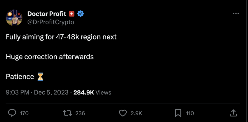 일반적인 믿음과는 달리 닥터 프로핏은 비트코인이 4만 달러를 돌파한 후 상당한 조정에 직면할 것이라는 논리를 단호히 거부합니다. 그는 3만 8,500달러까지 하락할 경우 현재의 게임 규칙이 바뀔 것이라고 강조합니다. 그의 예측은 20-30%로 추정되는 첫 번째 중요한 조정을 가정합니다. 그는 비트코인이 4만 7,000~4만 8,000달러 수준에 도달한 후 상당한 조정이 있을 것이라고 주장합니다.