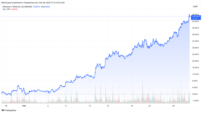 온체인 분석 플랫폼 Santiment에 따르면 이더리움은 11월 이후 가장 높은 수익성 있는 온체인 전송 비율을 자랑합니다. 또한 2월에는 46% 이상 가치가 상승했습니다. 이더리움은 이 글을 쓰는 현재 약 3,300달러에서 큰 저항과 싸우고 있습니다.