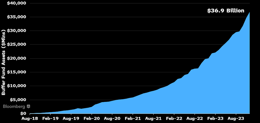 블룸버그의 애널리스트 제임스 세이파트는 또한 대부분의 성공적인 ETF는 느리게 시작한다는 점을 투자자들에게 상기시켰습니다. 그는 정의된 결과 ETF를 비교 대상으로 제시했습니다: