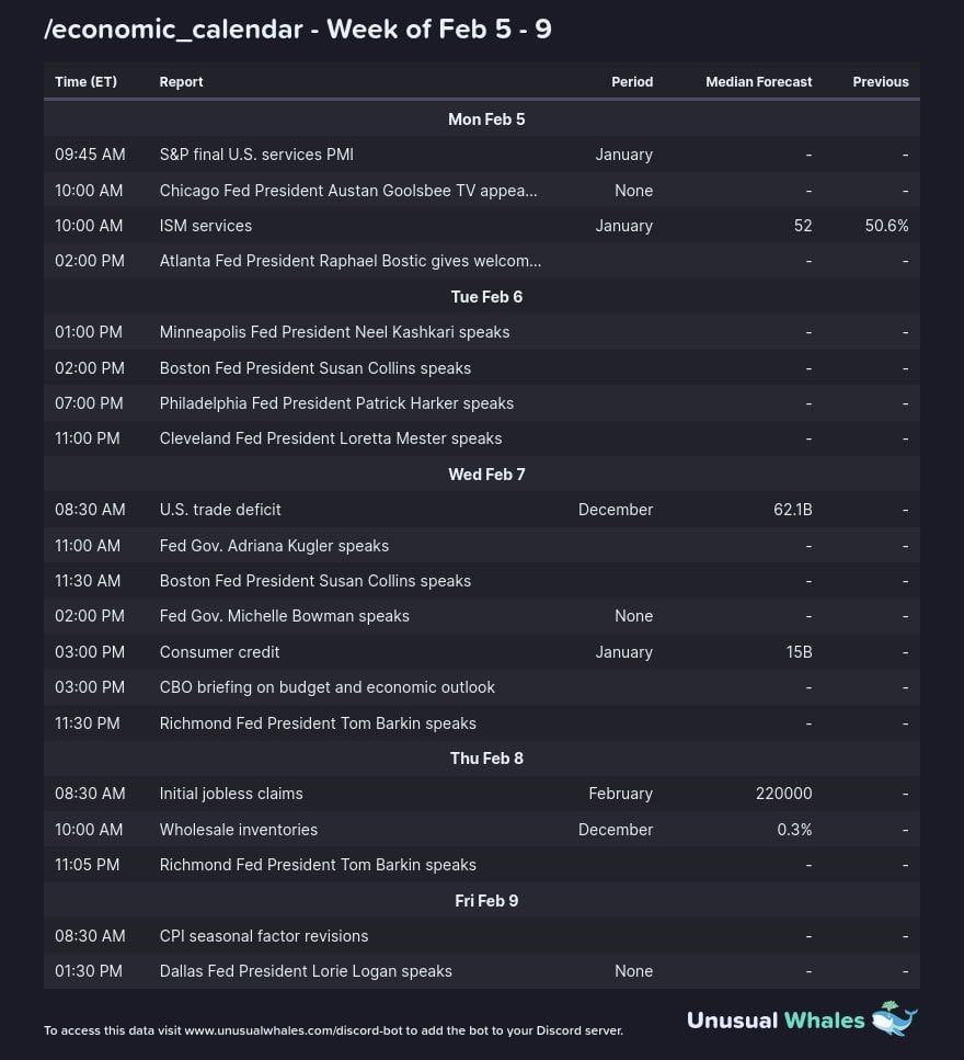 2월 5일 월요일에는 S&P 서비스업 구매관리자지수(PMI)와 공급관리자협회(ISM) 비제조업 PMI가 발표됩니다. 이러한 구매관리자지수 보고서는 시장과 경제가 어디로 향하고 있는지에 대한 인사이트를 제공하는 신뢰할 수 있는 경제 지표로 사용됩니다.