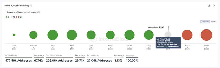 반대로 강력한 저항 구간은 $19.75에서 $26.75 사이입니다. 이는 LINK 가격이 이 수준으로 상승함에 따라 이익을 본 보유자들이 보유 자산을 처분하기 시작하여 결과적으로 가격에 하방 압력을 가할 수 있기 때문에 매도세가 발생할 가능성이 있음을 시사합니다.