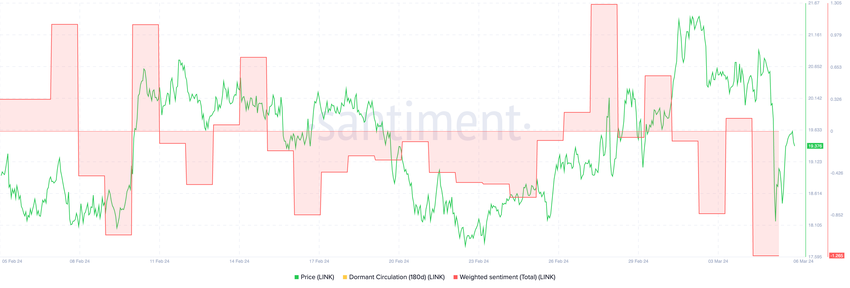 이러한 부정적인 정서가 휴면 유통 공급량의 현저한 감소와 동시에 존재한다는 것은 LINK에 대해 약세에서 중립적인 그림을 그려줍니다.