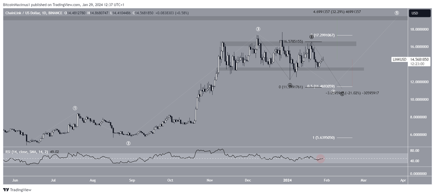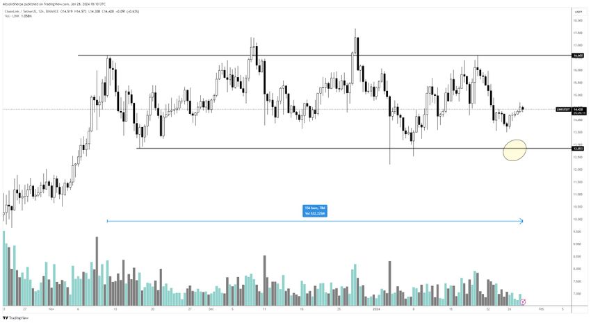 일일 시간대 차트를 보면 지난 82일 동안 LINK가 $13.30에서 $16.60 사이의 수평 범위에서 거래되었음을 알 수 있습니다. 저점과 고점 모두 여러 번 확인되었으며, 가장 최근에는 1월 20일에 확인되었습니다(빨간색 아이콘).