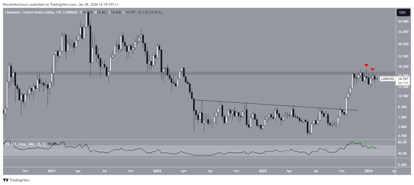 12월 마지막 주에 LINK 가격은 연중 최고가인 17.68달러에 도달했습니다. 그러나 이후 하락하여 두 개의 긴 위쪽 심지(빨간색 아이콘)와 낮은 고점을 형성했습니다. 이 하락은 장기적인 수평 저항 영역을 확인시켜주었습니다.