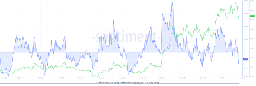 둘째, 시장가치 대비 실현가치(MVRV) 비율도 강세를 나타냅니다. MVRV 비율은 투자자의 수익 또는 손실을 평가합니다. 체인링크의 30일 MVRV가 -5.2%라는 것은 최근 투자자들이 손실을 봤다는 것을 의미합니다.