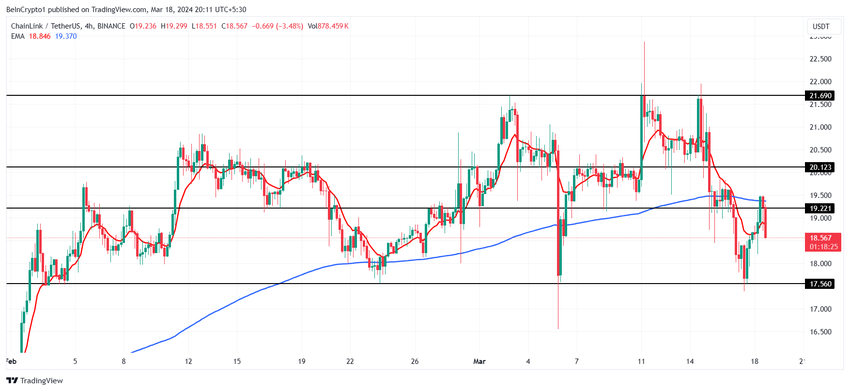 앞서 언급한 요인들을 고려할 때, 체인링크의 가격은 잠재적으로 반등하여 강세 랠리를 재점화할 수 있습니다. 이는 LINK가 50일 지수이동평균(EMA)뿐만 아니라 19달러를 지지선으로 회복하는 데 도움이 될 것입니다.