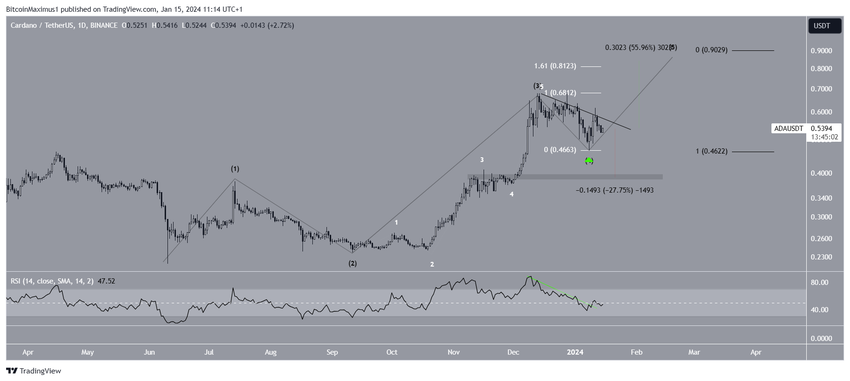 이 수치는 2023년 6월에 시작된 상승의 다섯 번째이자 마지막 파동 (검은색)에 ADA가 있음을 시사합니다. 5파는 1월 8일에 시작되었습니다(녹색 아이콘).