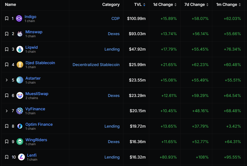 카르다노의 탄탄한 탈중앙 금융 생태계는 상위 10개 프로토콜의 성장에서 확인할 수 있습니다. 디파이라마 데이터에 따르면 이들 프로토콜은 지난 한 달 동안 상당한 두 자릿수 성장을 기록했습니다. 특히, 인디고는 네트워크에서 총 가치 고정(TVL) 1억 달러를 돌파한 최초의 디파이 프로토콜입니다.