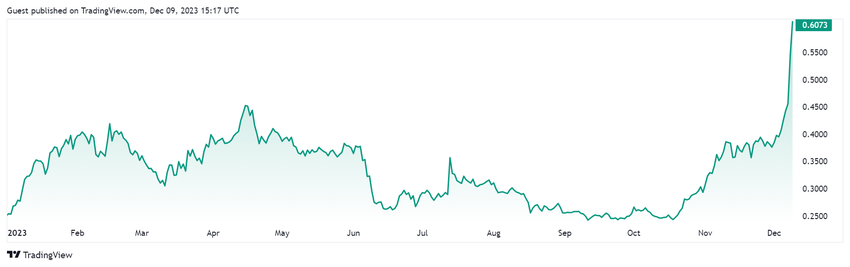 최근 카르다노 가격의 강세 추세는 올해 초에 누적된 모든 손실을 효과적으로 지워버렸습니다. 이는 2023년 에이다의 가치가 무려 150% 상승한 것으로, 대부분의 상승은 지난 6개월 동안 이뤄졌습니다.