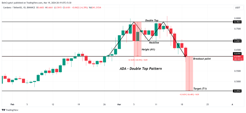카르다노의 가격은 작성 시점에 0.618 달러에 거래되고 있으며, 오늘 6% 조정 후 0.619 달러의 지지선을 잃었습니다. 3세대 암호화폐 ADA는 일일 차트에서 더블 탑 패턴이 형성되고 있습니다. 현재 $0.619가 패턴의 돌파 지점을 형성하고 있습니다.