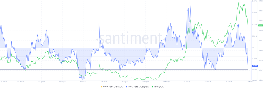 MVRV는 현재 시가총액과 실현된 가치를 비교하는 데 사용되는 지표입니다. 이는 암호화폐가 과거 가격에 비해 고평가 또는 저평가되었는지를 나타냅니다. 30일 MVRV가 -13.45%라는 것은 지난 달에 ADA를 매수한 투자자가 현재 13.45%의 손실을 보고 있다는 뜻입니다.