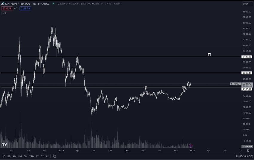 반등 이후 랠리가 가속화되어 12월 8일에 연중 최고가인 2,403달러를 기록했습니다. 이더리움의 상승 은 550일간의 수평 저항 구간을 돌파했다는 점에서 중요한 의미를 가집니다.