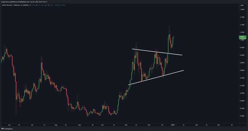 폴리곤(MATIC) 가격은 마침내 사상 최고치 이후 유지되던 장기 하강 저항 추세선 위에서 종가를 형성했습니다.