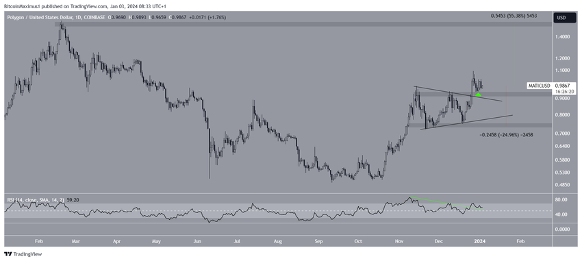 가격 움직임은 MATIC이 대칭 삼각형과 $0.95 수평 영역에서 돌파했음을 보여줍니다. 그런 다음 지지선으로 확인되었습니다(녹색 아이콘). 일일 RSI는 지표가 약세 다이버전스 추세선(녹색)을 돌파한 이후 강세 전망과 일치합니다.