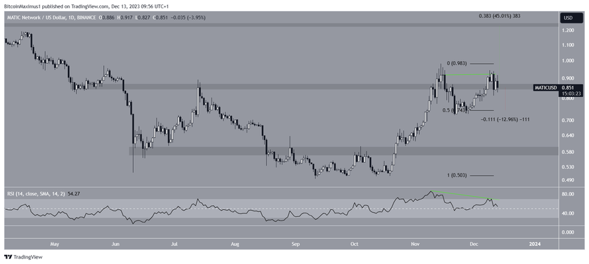MATIC 가격이 $0.85 이하로 마감하면 수평 지지선인 $0.74까지 13% 하락할 가능성이 있습니다.
