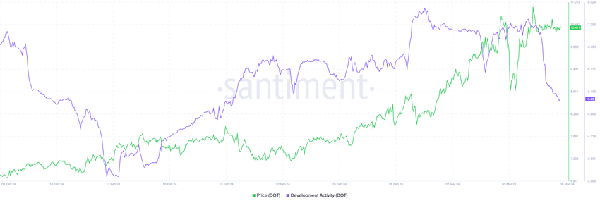 DOT 개발 활동은 2월 13일 13.10에서 3월 1일 17.85로 상승하여 약 2주 동안 36.26% 증가했습니다. 그러나 개발 활동이 크게 개선된 이후 3월 7일과 3월 8일 사이에는 17.14에서 15.29로 큰 폭으로 하락했습니다.