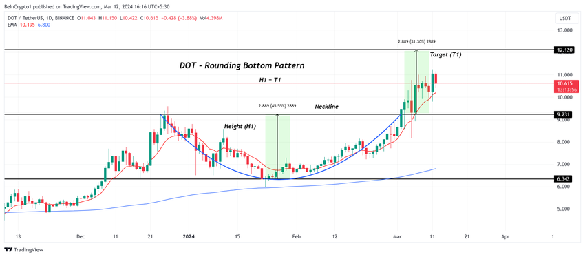 10.61달러인 폴카닷의 가격은 이미 예상 상승률인 31.3%의 절반을 달성하며 목표 가격인 12달러에 가까워졌습니다. 시장 상황이 추가 상승을 뒷받침한다면, DOT는 결국 이 목표에 도달해 강세 패턴을 완성할 수 있습니다.