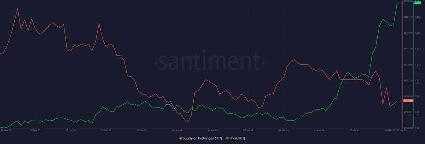 이는 지속적인 상승과 확실한 이익에도 불구하고 투자자들이 여전히 FET를 축적하고 있음을 보여줍니다. 결과적으로 추가 가격 상승을 지지하는 것입니다. 거래소의 FET 잔액 감소에서도 동일한 현상을 관찰할 수 있습니다. 이는 일반적으로 투자자의 행동으로 확인된 암호화폐 자산에 대한 잠재적인 매수 관심의 신호이며, 이는 랠리를 지속할 수 있습니다.