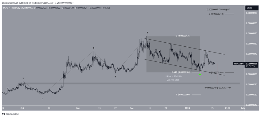 확인되지는 않았지만, PEPE 가격이 채널의 지지 추세선과 0.618 피보나치 되돌림 지지선(녹색) 에서 반등했기 때문에 1월 8일에 조정이 끝났을 수 있습니다.