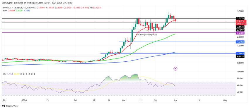Fetch.ai의 가격은 50일 지수이동평균(EMA)을 잃은 후 심리적지지선인 2.9달러를거의 잃었습니다. 앞서 언급한 요인들을 고려할 때 FET는 이전에 여러 차례 지지선으로 테스트되었기 때문에 2.4달러까지 하락할 가능성이 있습니다.