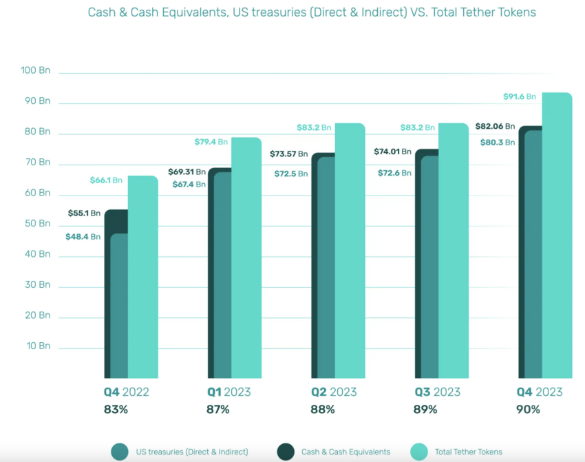 2023년 4분기에 테더는 916억 달러의 네이티브 토큰과 약 820억 6천만 달러의 현금 및 현금성 자산을 보유했습니다.