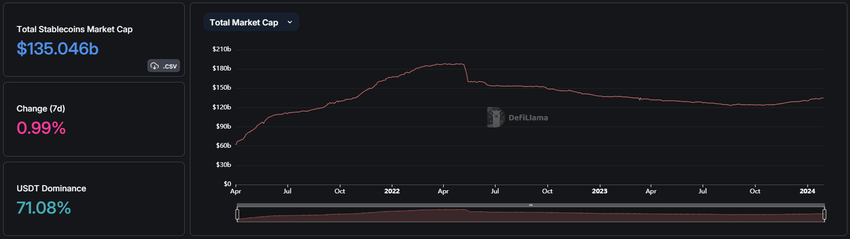 스테이블코인은 보통 법정화폐에 1대 1로 고정되어 있으며, 현금이나 채권 보유고로 뒷받침됩니다. 스테이블코인은 1조 7천억 달러 규모의 디지털 자산 시장에서 상당 부분을 차지하고 있습니다. 현재 스테이블코인 시가총액은 모든 체인에서 1,350억 달러가 넘습니다.