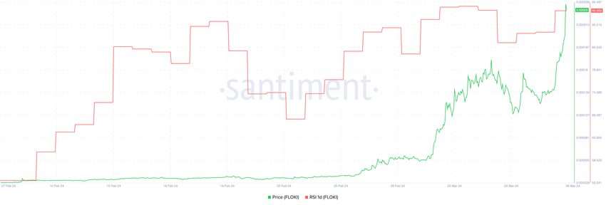 그러나 역사적 맥락을 보면 RSI가 과매수 상태를 나타내는 경우에도 FLOKI는 가격 상승 모멘텀을 유지할 수 있음을 알 수 있습니다. 2023년 1월, FLOKI 가격은 거의 4배 가까이 급등했고, RSI는 하루 80과 90 이상의 값을 꾸준히 유지했습니다.