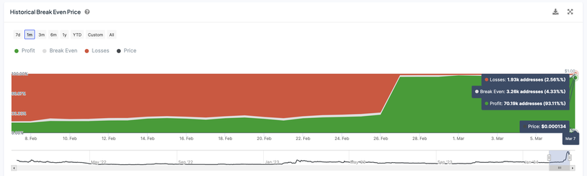 수익을 본 FLOKI 보유자의 비율이 마지막으로 그렇게 높았던 것은 1년 전인 2023년 2월 16일이었습니다.