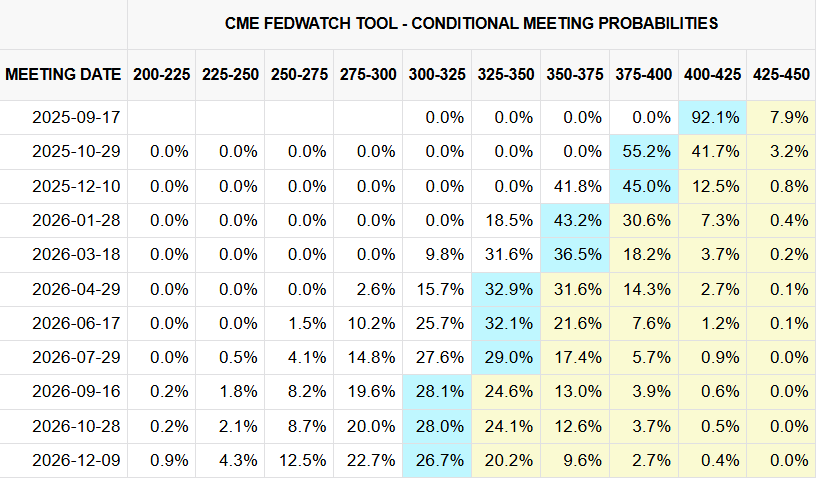CME 거래소의 페드워치 금리 예상치(2025년 8월 18일)