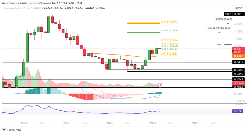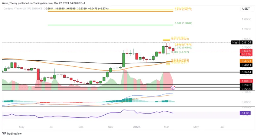 이 저항선을 돌파하면 추가 상승의 발판이 마련될 수 있으며, 다음 중요한 장애물은 약 0.66달러입니다. 또는 카르다노가 조정 단계를 끝내려면 황금 비율 수준인 약 0.72달러를 넘어야 합니다.