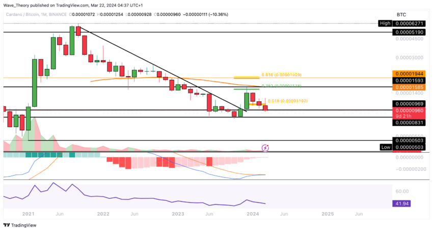 비트코인(BTC)에 대해 카르다노는 최근 약 0.000011 BTC에 위치한 중요한 황금 비율 지지선을 돌파했습니다. 결과적으로 카르다노는 이제 약 0.0000083 BTC ~ 0.0000097 BTC 범위 내에서 수평 지지선에 직면하게 되었습니다.