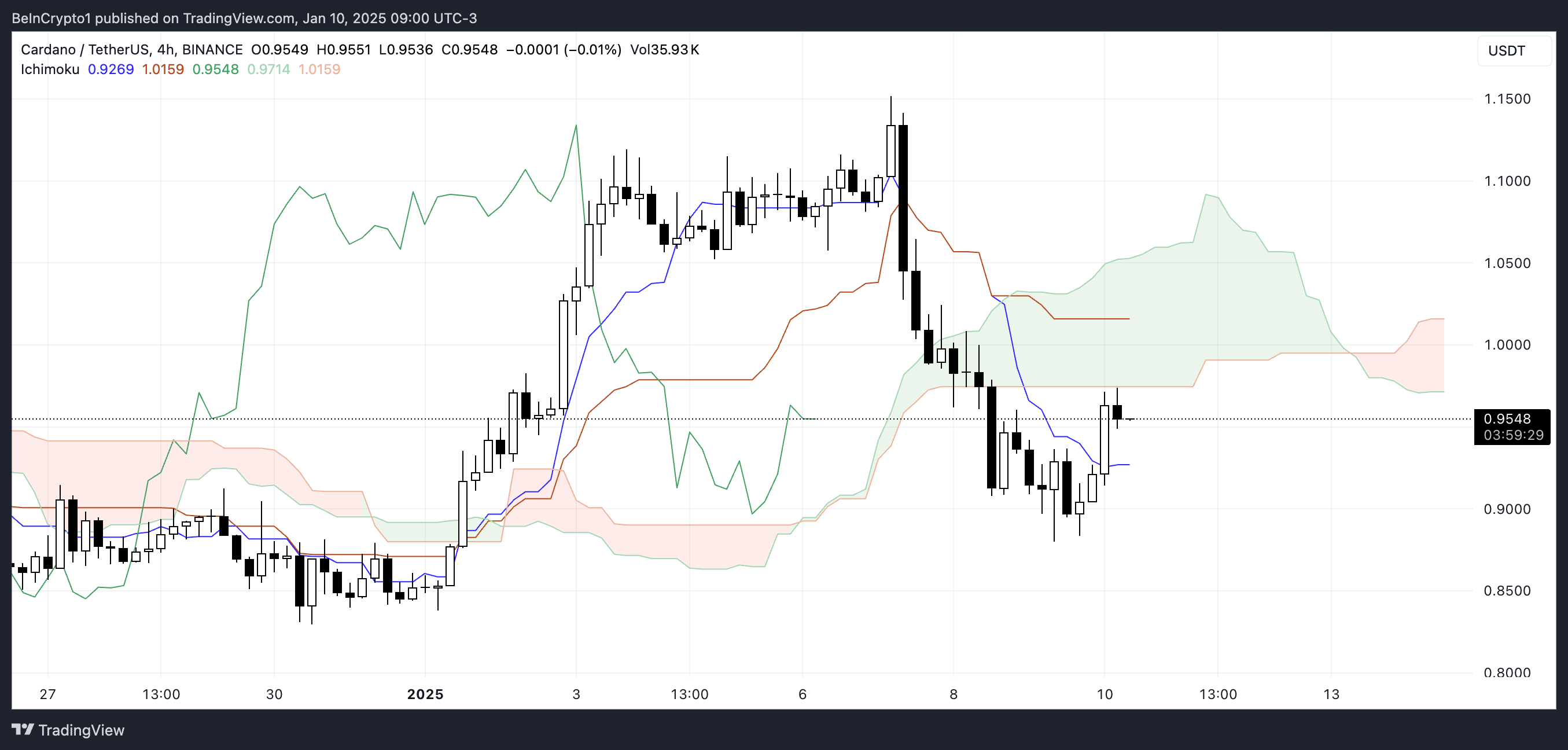 카르다노의 이치모쿠 클라우드 차트는 현재 일반적으로 약세 신호인 빨간색 구름 아래에서 거래되고 있습니다. 센코우 스팬 A(녹색 선)와 센코우 스팬 B(주황색 선)로 형성된 빨간색 구름은 오버헤드 저항을 반영하며, 하향 경사는 약세 심리를 더욱 강조합니다.