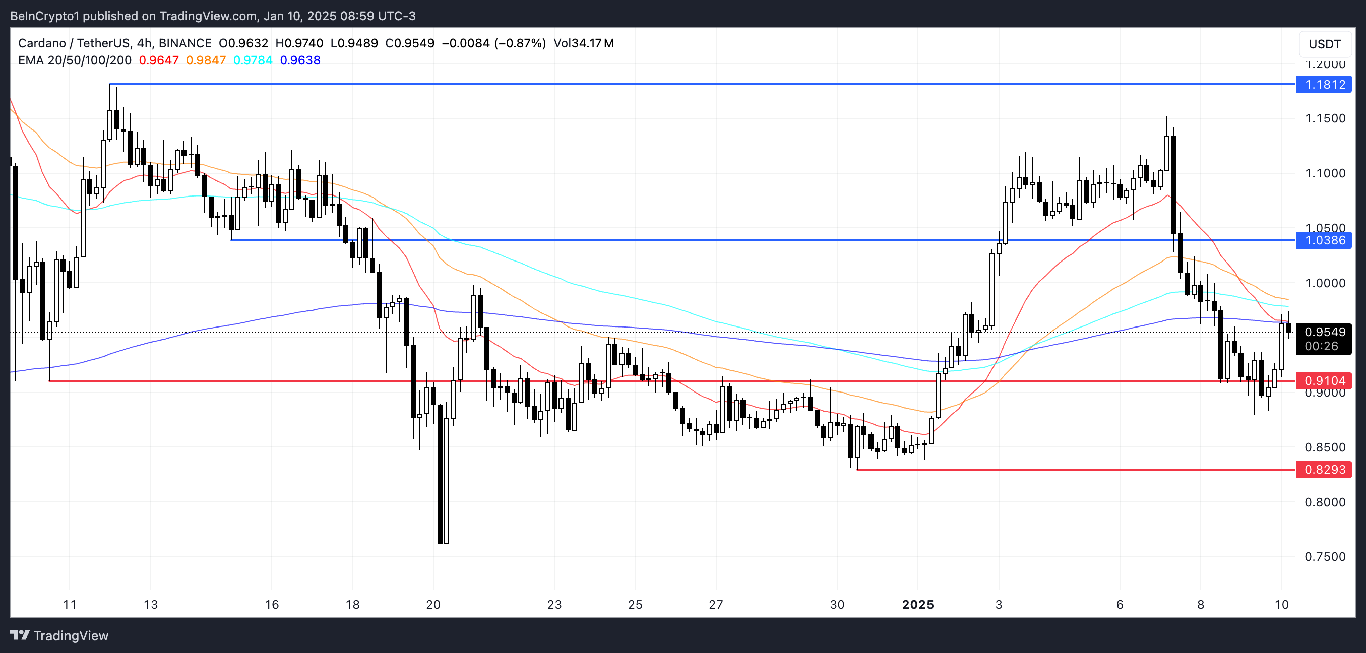 반대로 EMA가 상승 추세로 전환하면 카르다노 가격은 저항선인 1.03달러에 도전할 수 있습니다. 이 지점을 돌파하면 가격은 1.18달러까지 상승할 수 있으며, 현재 수준에서 24% 상승할 가능성이 있습니다.