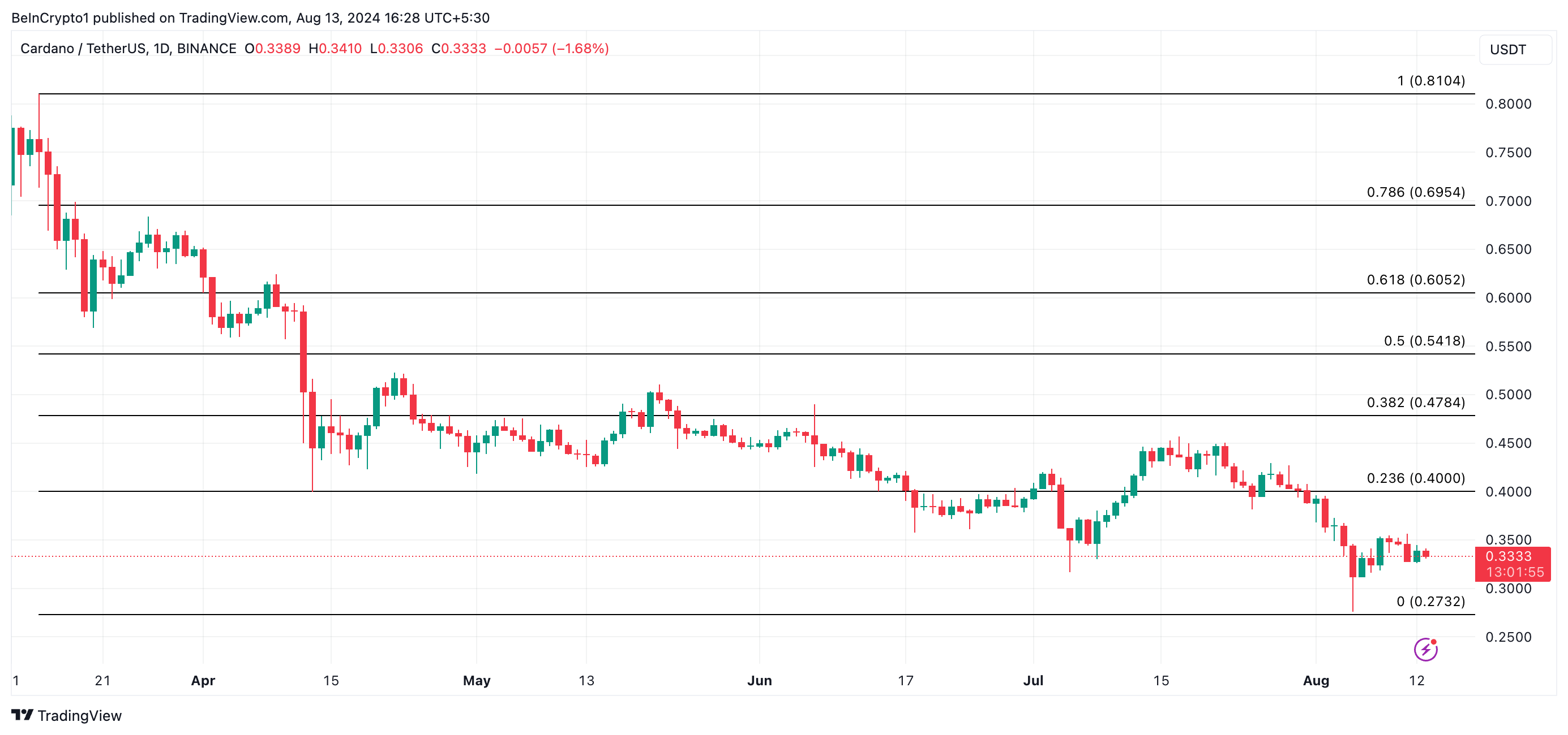 ADA에 대한 수요가 계속 약화된다면 다음 목표 가격은 0.27달러가 될 수 있습니다. 알트코인은 광범위한 시장 침체기에 8월 5일에 마지막으로 이 최저치를 기록했으며, 이전에는 2023년 10월에 이 수준에서 거래된 바 있습니다.