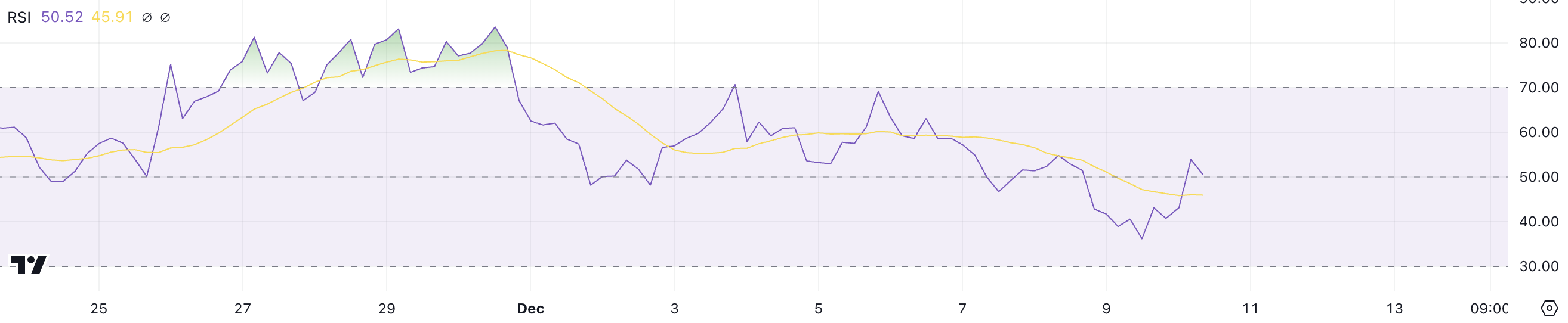 VIRTUAL의 RSI는 11월 26일부터 11월 30일까지 70 이상을 유지한 후 현재 50에 위치해 있습니다. 이 변화는 이전에 가격을 과매수 영역으로 밀어 올렸던 상승 모멘텀이 감소했음을 나타냅니다.
