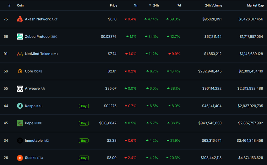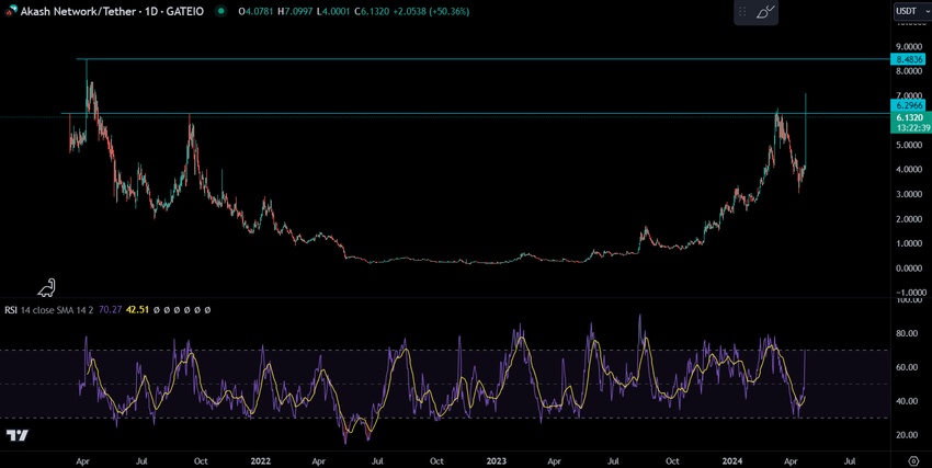 한국의 대표적인 암호화폐 거래소인 업비트에 상장한 이후, AKT는 50% 이상 상승하여 7달러에 도달했습니다. 그 덕에 현재 AKT는 시가총액 기준 75위를 차지하며 10억 달러를 돌파했습니다. 현재 AKT의 시가총액은 14억 달러이며, 일일 거래량은 9,500만 달러에 달합니다.