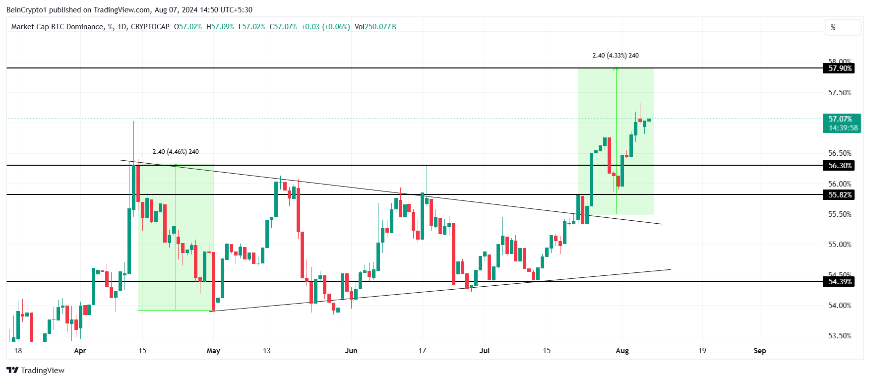 이 패턴은 돌파 이후 비트코인의 지배력이 4.33% 상승할 것을 시사하며, 현재로서는 BTC가 이를 실현하고 있습니다. 현재 BTC.D는 55.49%에서 57.07%로 상승했으며, 이러한 상황이 지속된다면 57.90%까지 상승할 수 있습니다.