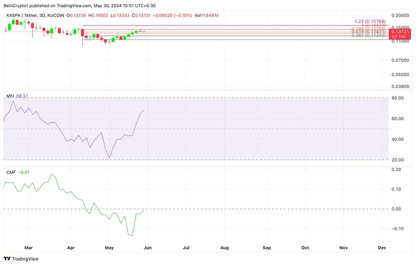 이 지표의 점진적인 상승은 해당 자산에 대한 매수 압력이 꾸준히 증가하고 있음을 시사합니다. 이 글을 쓰는 시점을 기준으로 KAS의 CMF는 상승 추세에 있으며 중앙선 위에 있습니다.