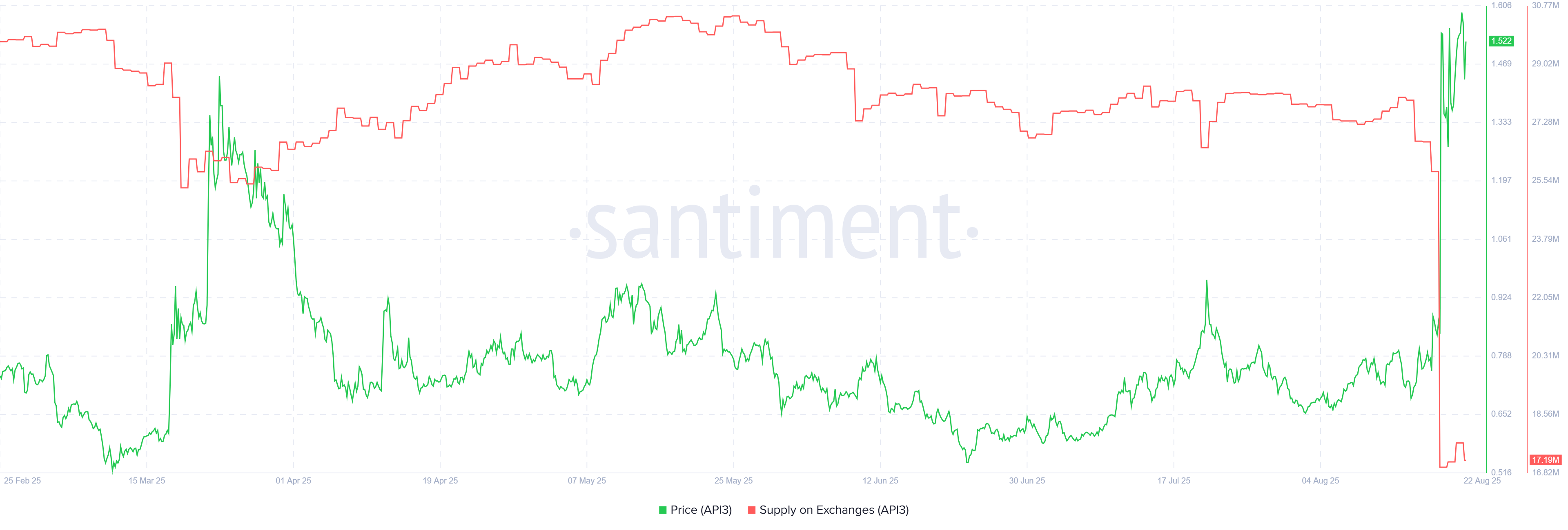 오라클 중심의 프로젝트인 API3는 8월에 투자자들의 관심을 다시 얻어 가격이 130% 이상 상승했습니다. 동시에 거래소 보유량은 올해 최저 수준으로 떨어졌습니다.