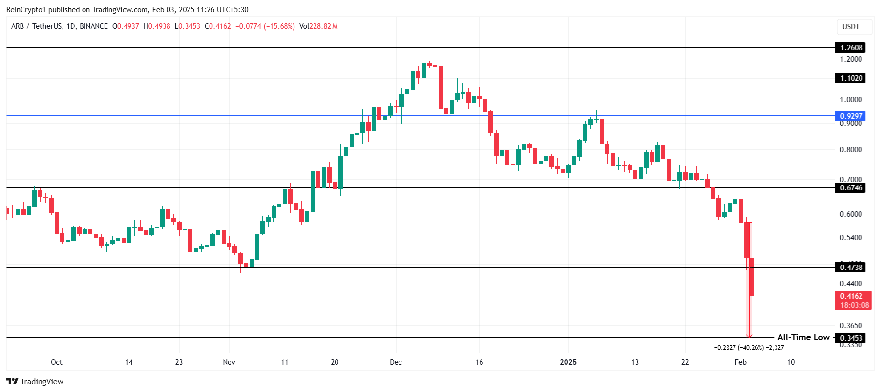 아비트럼의 가격은 지난 24시간 동안 40% 급락하여 0.345 달러의 사상 최저치로 떨어졌습니다. 이 급격한 하락은 시장의 불확실성이 증가하는 가운데 발생하여 알트코인의 단기 안정성에 대한 우려를 불러일으켰습니다.