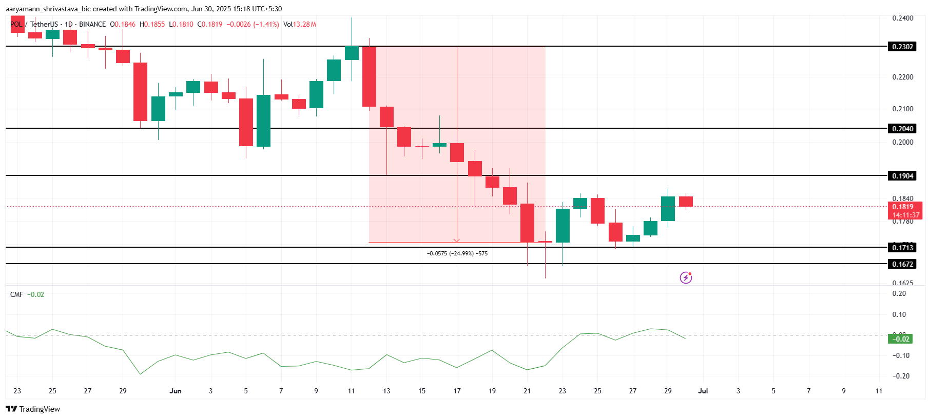 차이킨 머니 플로우(CMF) 지표는 폴리곤의 유입이 점차 증가하고 있음을 보여주며, 이는 관심이 증가하고 있음을 나타냅니다. 이 추세가 계속되면 POL은 0.190달러 저항을 돌파하고 0.204달러로 상승할 수 있습니다. 그러나 모멘텀이 멈추면 POL은 저항을 돌파하지 못하고 0.171달러 아래로 떨어져 0.167달러를 통과하여 상승 전망이 무효화될 수 있습니다.