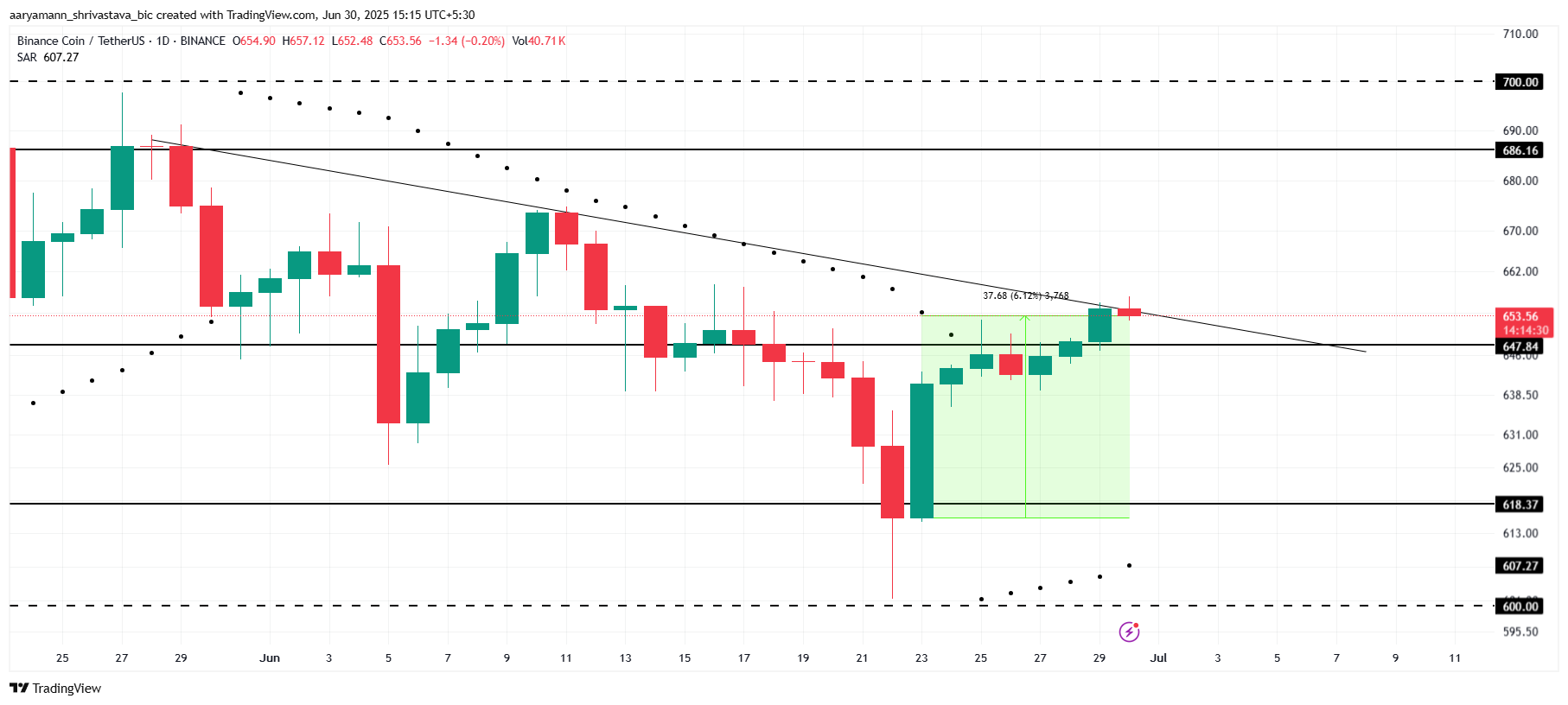 파라볼릭 SAR 지표는 현재 캔들스틱 아래에 위치하여 BNB의 지속적인 상승 모멘텀을 나타냅니다. 다음 저항 수준은 686달러에 있지만, 알트코인은 먼저 647달러 지지를 확보해야 합니다. 이 지지가 유지되면, BNB는 686달러를 목표로 할 수 있습니다. 그러나 가격이 647달러를 유지하지 못하면 BNB는 618달러로 하락하여 상승 전망이 무효화될 수 있습니다.
