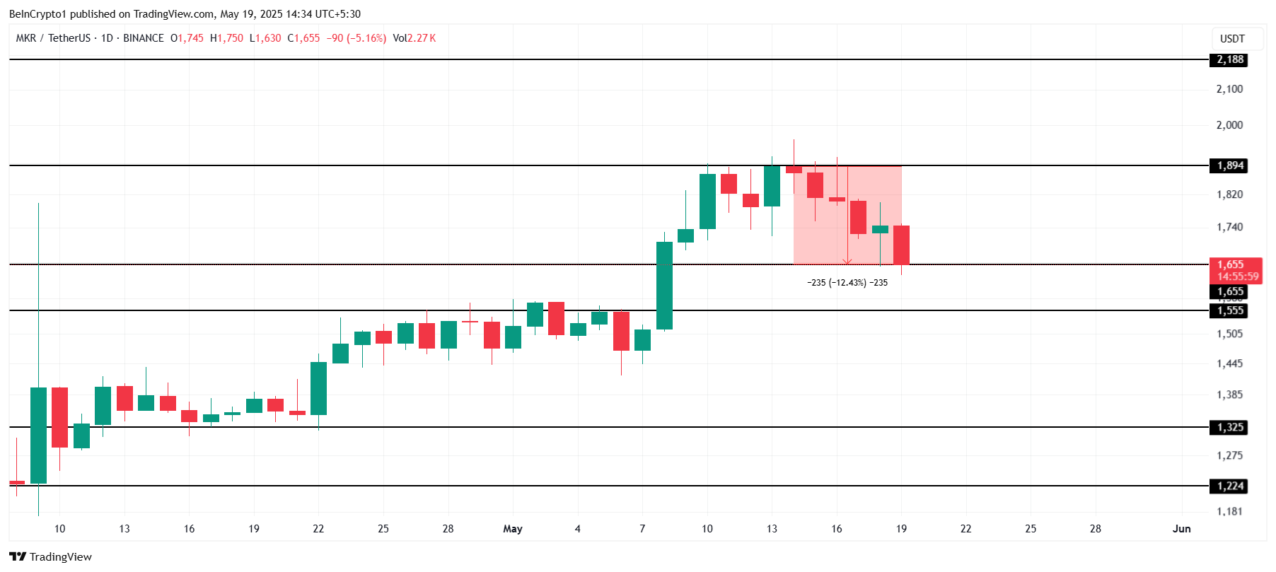 그러나 MKR이 1655달러의 지지 수준 아래로 떨어지면, 1555달러 또는 더 아래로 1325달러까지 하락할 위험이 있습니다. 이러한 하락은 강세 전망을 무효화하고, 매도 압력이 증가하며 장기적인 하락세로 이어질 수 있습니다.
