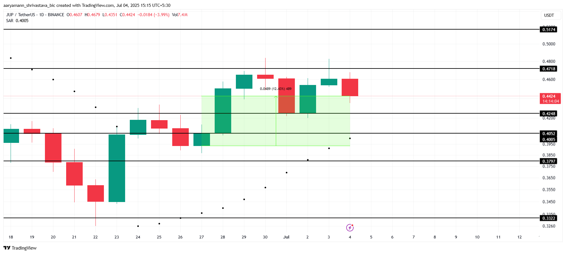JUP는 지난 7일 동안 12.4% 상승하며 긍정적인 한 주를 보냈습니다. 현재 0.442달러에 거래되고 있습니다. 이 알트코인은 0.471달러와 0.424달러 사이에서 바닥을 다지고 있으며, 이는 돌파를 준비하고 있음을 나타냅니다.
