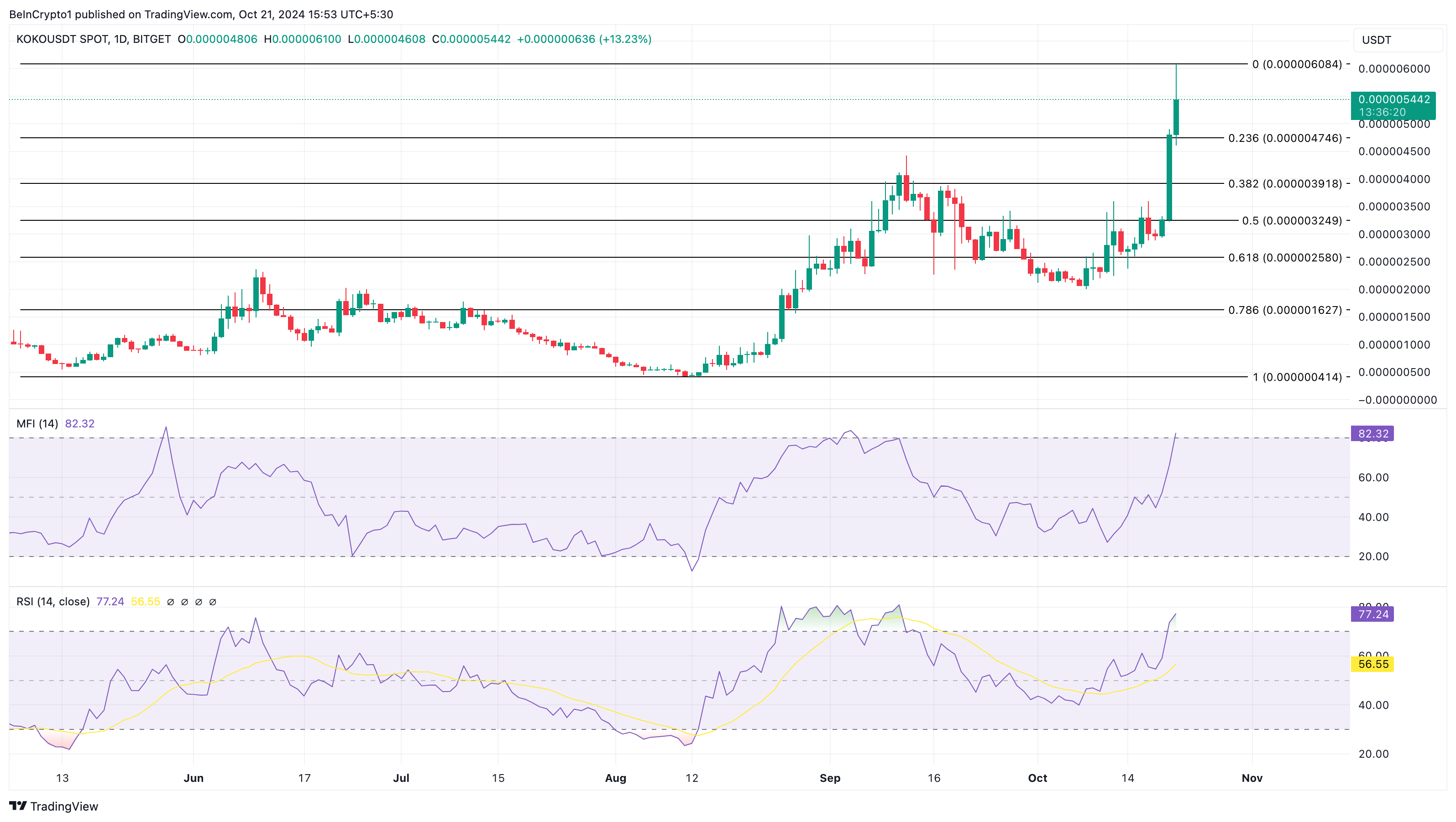 그 결과, KOKO의 가격은 지난 24시간 동안 70% 상승하여 현재 0.0000055달러에 거래되고 있습니다. 일간 차트에 따르면 상대 강도 지수(RSI)는 보통 70.00 이상인 과매수 수준을 넘어섰습니다.