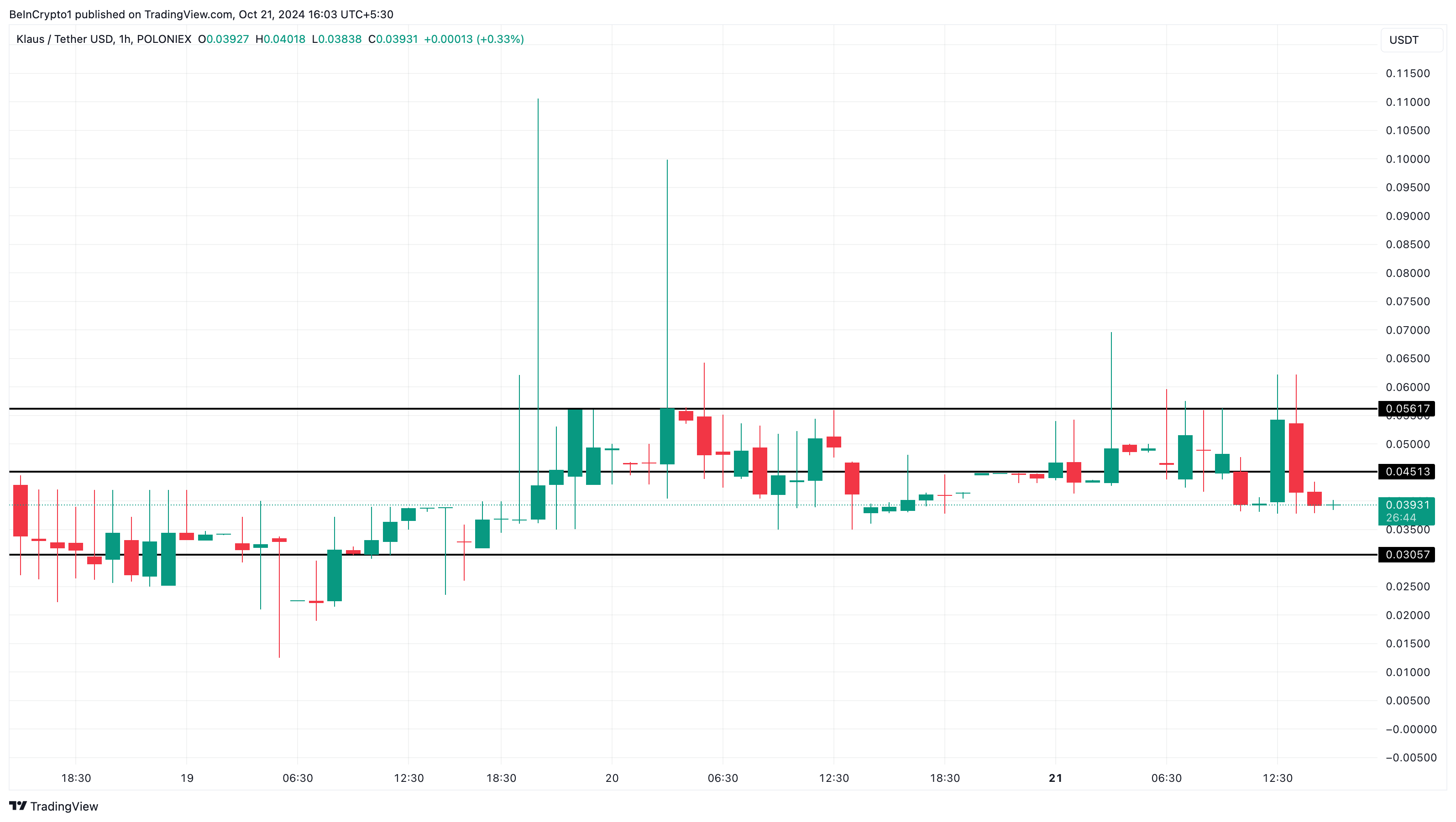 현재 KLAUS의 가격은 0.040달러입니다. 1시간 차트에서 이 알트코인은 0.045달러의 주요 저항선에 직면해 있으며, 이는 KLAUS의 가격이 단기적으로 계속 어려움을 겪을 수 있는 한 가지 이유입니다.
