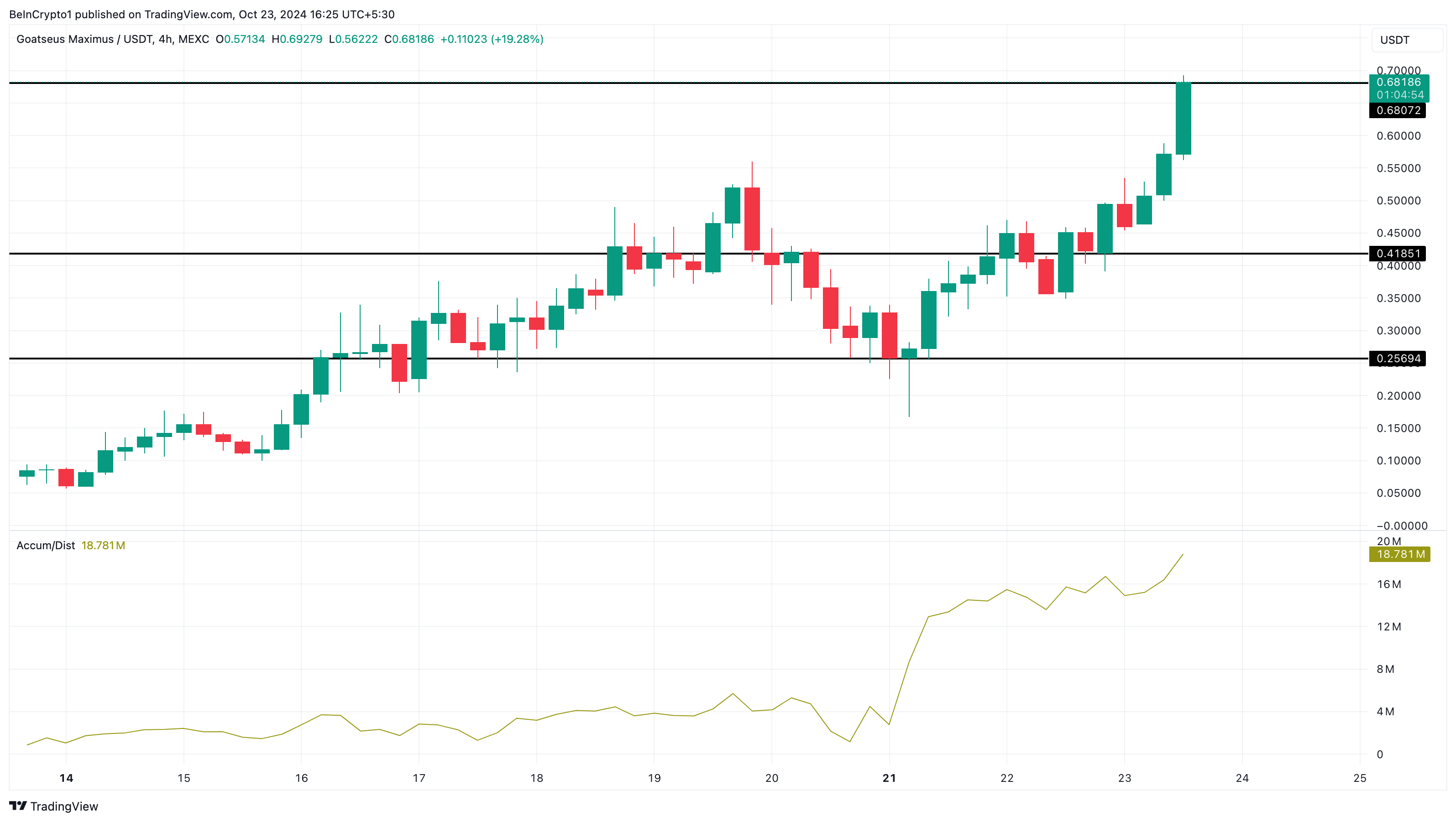 기술적 관점에서 볼 때, 누적/분배(A/D) 선은 시장이 GOAT를 계속 구매하고 있음을 보여줍니다. 이 추세가 계속된다면, 알트코인의 가치는 0.70달러를 넘어 1달러에 가까워질 수 있습니다.