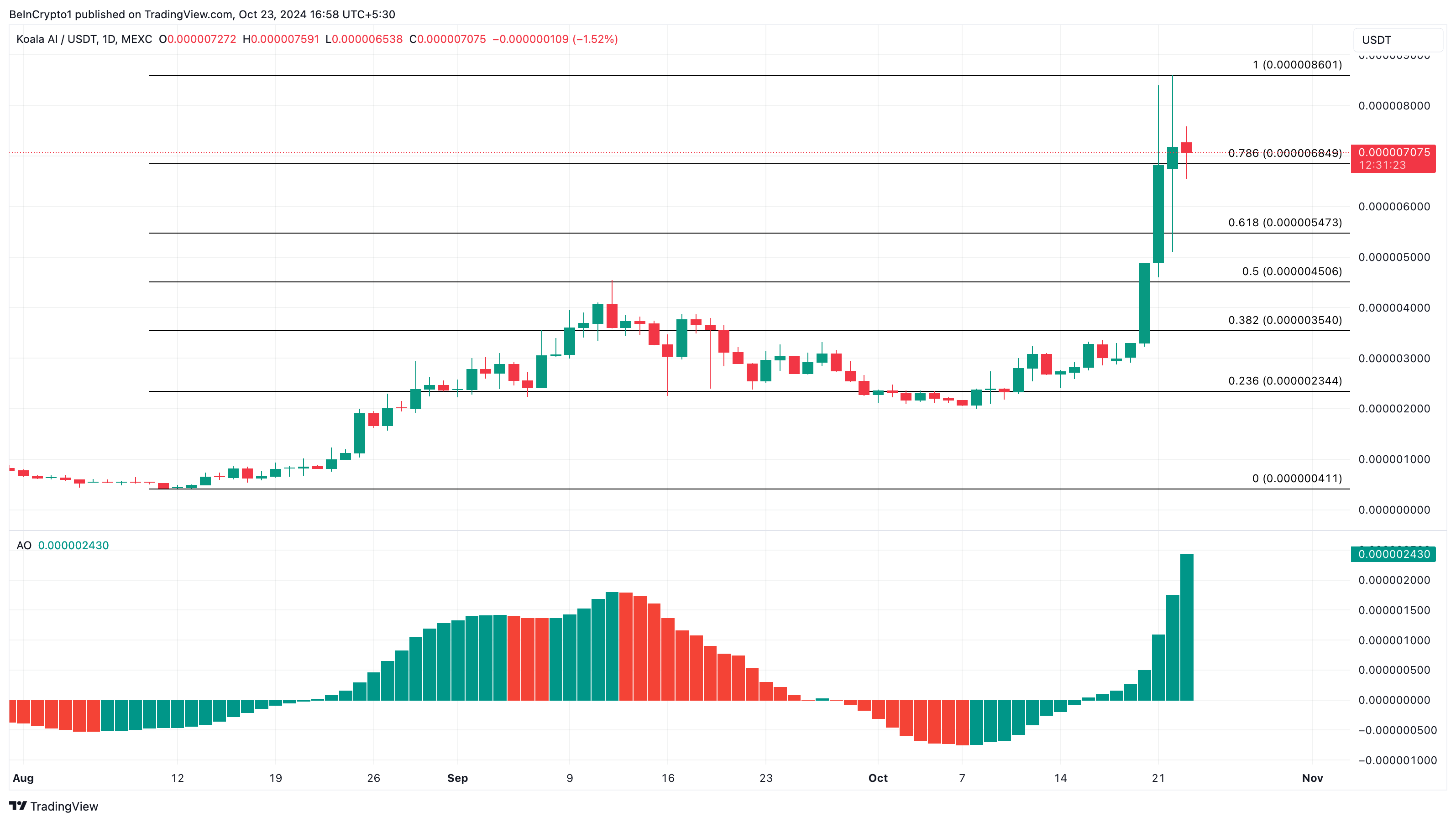 그러나 멋진 발진기(AO)는 모멘텀을 측정하며 긍정적으로 변했습니다. 이 긍정적인 판독값은 시장 참여자들이 KOKO 하락을 매수하기 시작했음을 시사합니다. 이 추세가 계속된다면, 알트코인의 가격은 0.0000086달러로 상승할 수 있습니다.